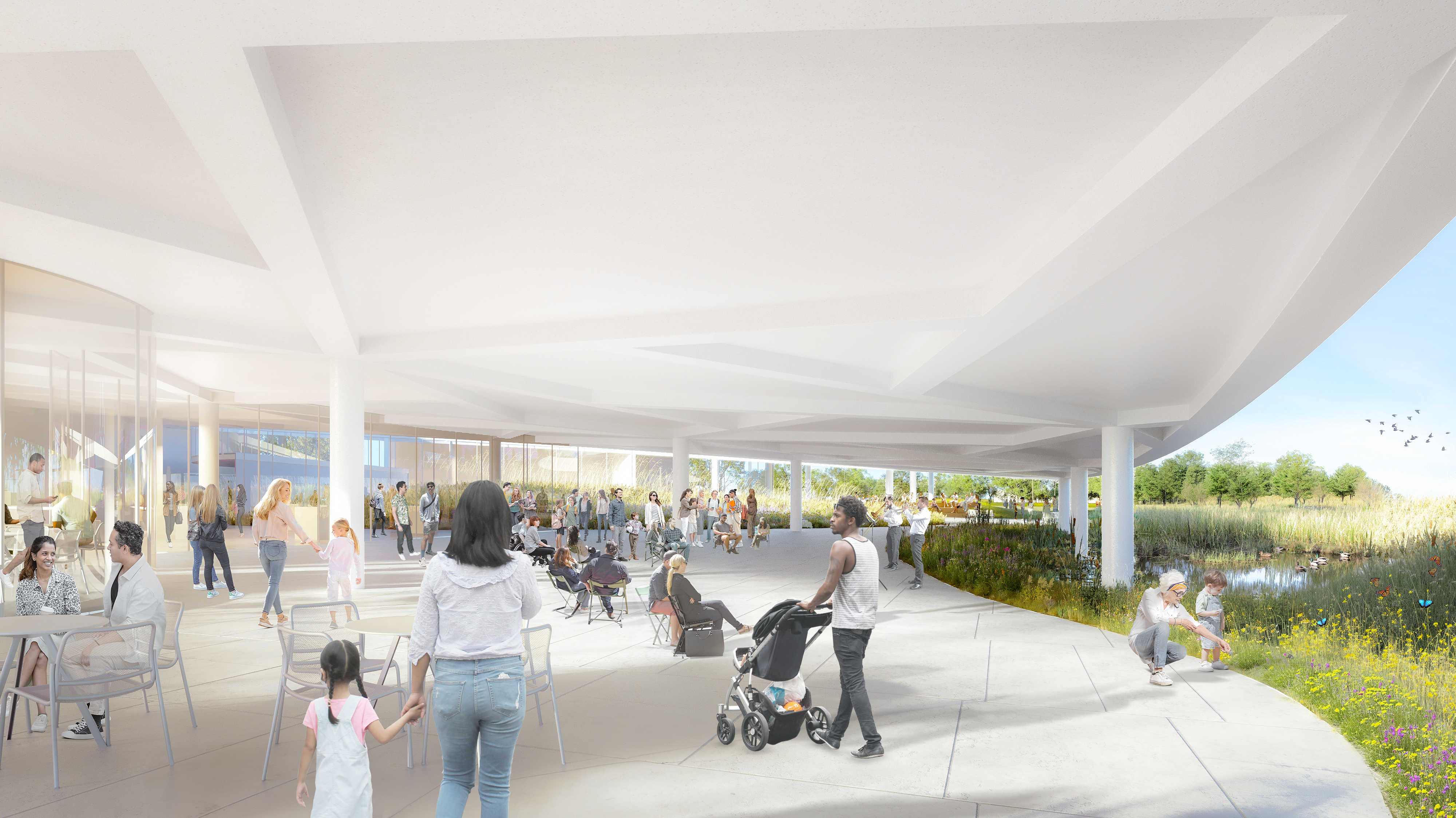 At the heart of the building, a layered landscape draws on the ecology and character of the surrounding region, connecting the museum and its visitors to the distinct natural environment of the Midwest. This interior landscape serves as both a communal gathering space and an extension of the arboretum beyond—grounding the institution in its place while offering a living counterpoint to the collections displayed within.